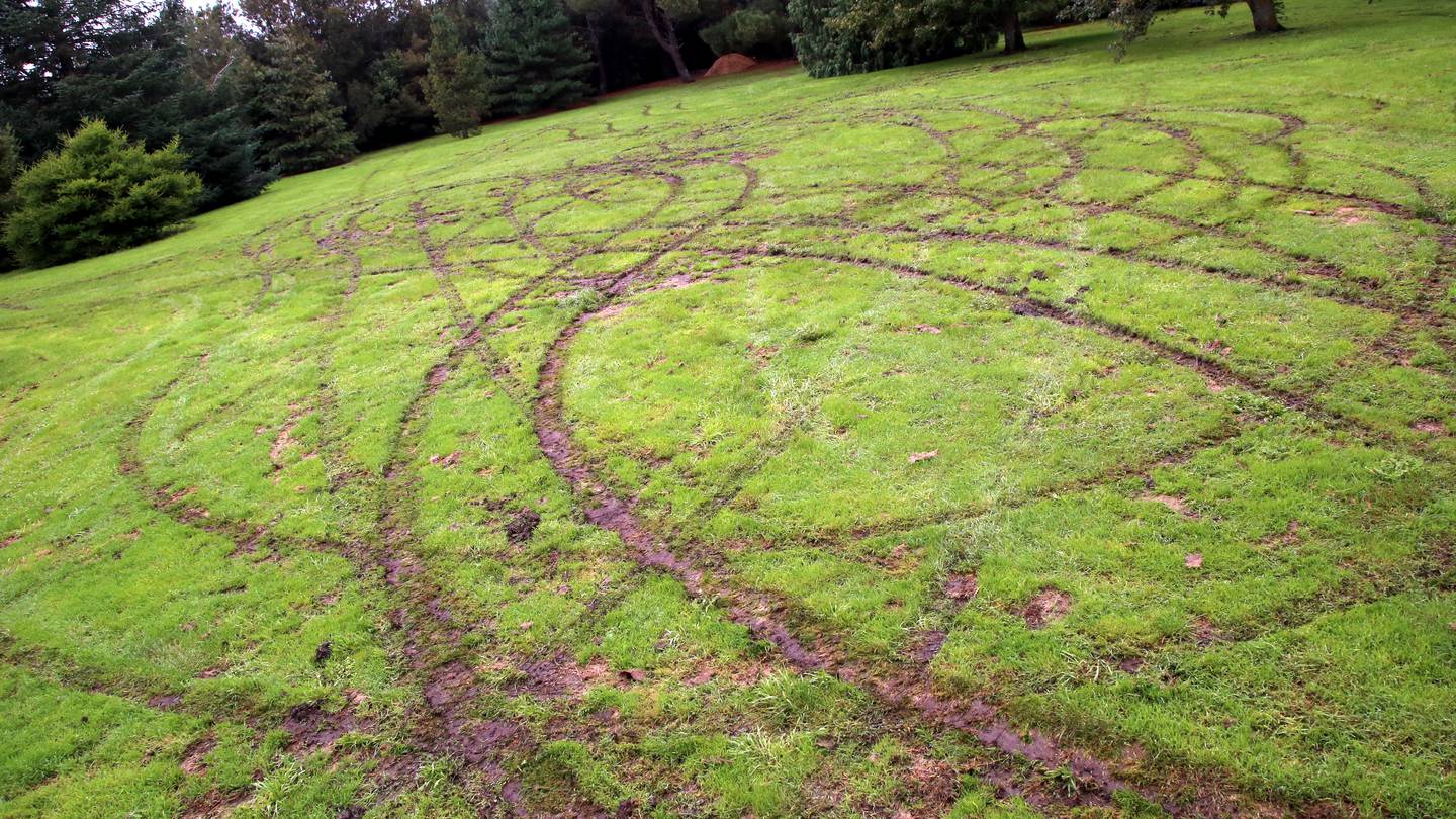 Vandals destroy green grassy field in a natural beauty spot of England’s country side. Driving what police think was a stolen car, as no one in their right mind would drive their own car and do so much damaged to such a lovely part of the English landscape. The deep wheel track ruts across the whole field can even be seen in space. An observer aboard the international space station commented, I can clearly see deep ruts in this once lovely landscape, obviously it was a stolen car driven by vandals determined to cause headline news.